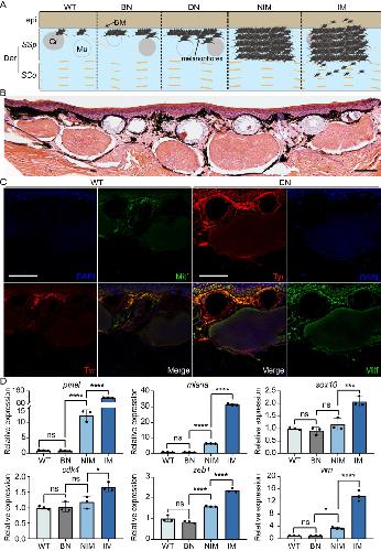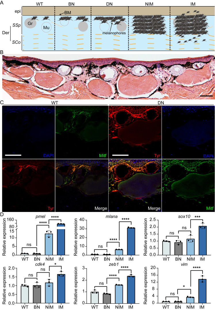 Figure 3. Pathological and molecular characteristics at various melanocytic neoplasms of cdkn2b-/-/tp53-/- Xenopus tropicalis. (A) Schematic representation illustrating the progression of melanoma in Xenopus tropicalis. The designations BN, DN, NIM, and IM correspond to benign nevi, dysplastic nevi, non-invasive melanoma, and invasive melanoma, respectively. Der and epi refer to the dermis and epidermis, while SSp and SCo denote the stratum spinosum and stratum corneum, respectively. BM, Gr, and Mu indicate the basement membrane, granular gland, and mucous gland. For clarity, the schematic presents only select tissue structures within the skin of Xenopus tropicalis. (B) Hematoxylin and eosin staining results for a 22-month-old cdkn2b-/-/tp53-/- Xenopus tropicalis exhibiting dysplastic nevi. (C) The DN (dysplastic nevi) samples show immunofluorescence staining results adjacent to the paraffin sections presented in B, while WT denotes the immunofluorescence results for the dorsal skin of a 22-month-old wild-type Xenopus tropicalis. The primary antibodies utilized for immunofluorescence were Tyr and Mitf. "Merge" indicates the merged immunofluorescence results. Scale bars in B and C represent 50 μm, with the images displaying representative staining results from ten tissue sections. (D) qPCR results for marker genes associated with the malignant progression of melanoma (pmel, mlana, sox10, cdk4, zeb1, and vim) in the dorsal skin of a 22-month-old wild-type Xenopus tropicalis and age-matched cdkn2b-/-/tp53-/- Xenopus tropicalis with benign nevi, non-invasive melanoma, and invasive melanoma (n=3). In the statistical analysis, multiple comparisons were conducted using ordinary one-way ANOVA; "ns" indicates no significant difference, * denotes a P-value < 0.05, ** indicates a P-value < 0.01, *** indicates a P-value < 0.001, and **** indicates a P-value < 0.0001. |