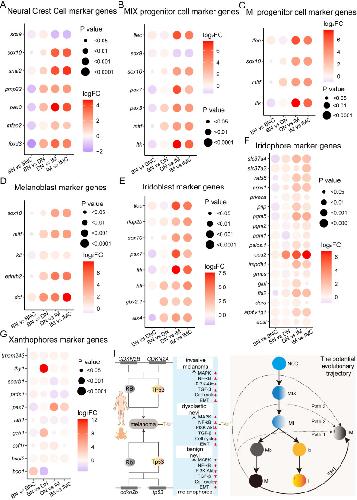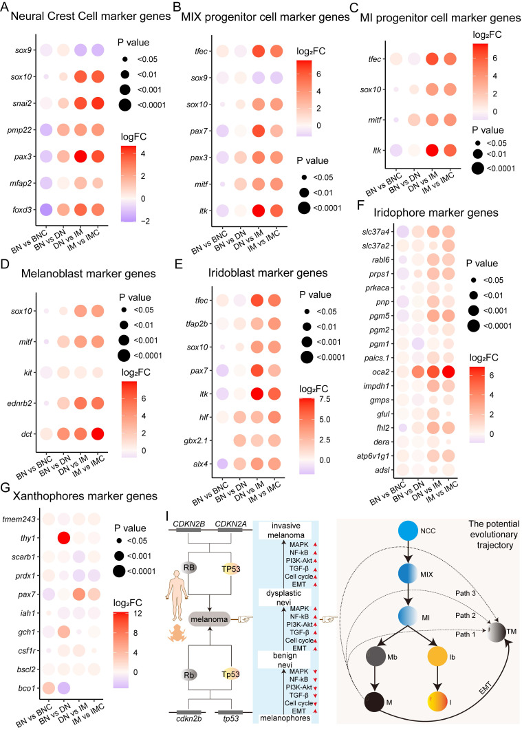 Figure 7. The expression of pigment cell precursor marker genes increases progressively during the development of cdkn2b-/-/tp53-/- Xenopus tropicalis melanoma. (A-G) Figures present the expression profiles of neural crest cell (NCC), MIX progenitor cell (progenitor cells capable of differentiating into melanophores, xanthophores, and iridophores), MI progenitor cell (progenitor cells capable of differentiating into melanophores and iridophores), melanoblast (Mb), iridoblast (Ib), iridophore (I), and xanthophore (X) marker genes during the progression of cdkn2b-/-/tp53-/- Xenopus tropicalis melanoma. (I) The schematic diagram provides a graphical summary depicting the establishment of a cdkn2b-/-/tp53-/- Xenopus tropicalis melanoma model to recapitulate the progression of human CDKN2A-HM. The illustration also outlines potential developmental pathways of melanophores and iridophores in Xenopus tropicalis, with Path1, Path2, and Path3 indicating potential dedifferentiation routes of cdkn2b-/-/tp53-/- Xenopus tropicalis melanoma. TM indicates melanoma cells. BN vs BNC, BN vs DN, DN vs IM, IM vs IMC indicate comparative analyses between benign nevi adjacent tissues and benign nevi, benign nevi and dysplastic nevi, dysplastic nevi and invasive melanoma samples, adjacent invasive melanoma tissues and invasive melanoma, respectively. |