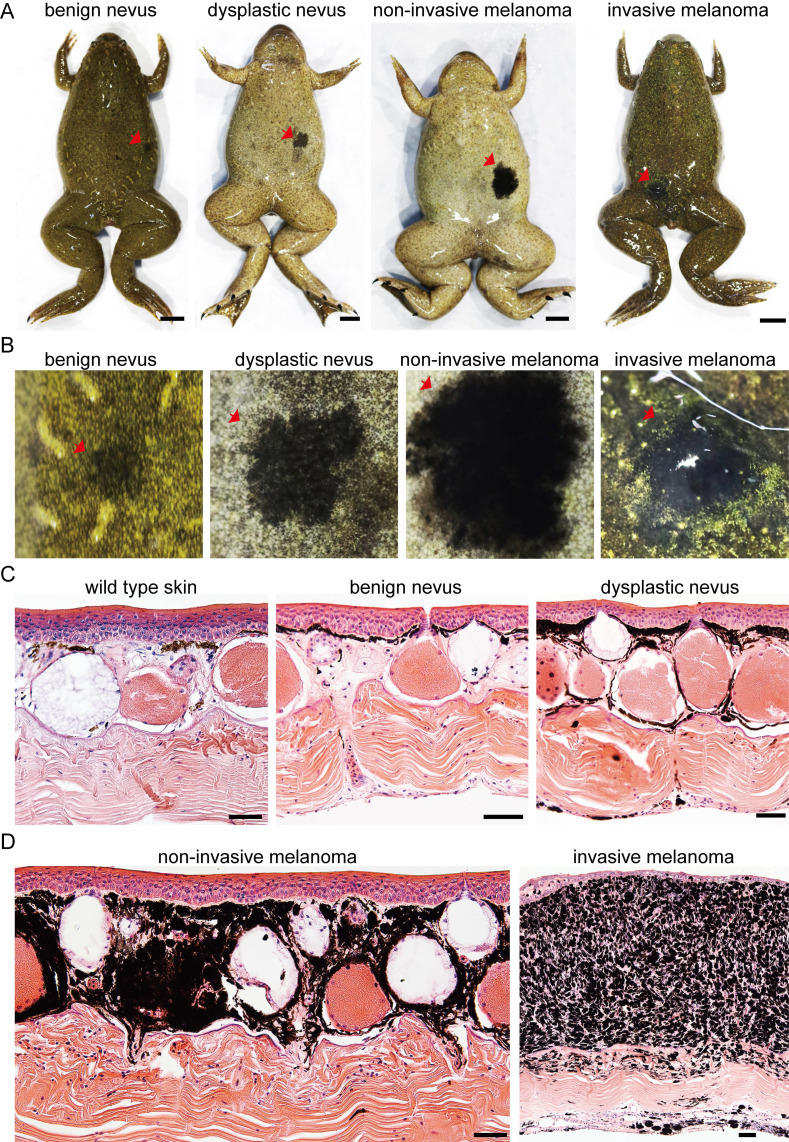 Figure 2. Development of cdkn2b-/-/tp53-/- Xenopus tropicalis melanoma. (A) Representative images of benign nevus, dysplastic nevus, non-invasive melanoma, and invasive melanoma spontaneously generated in 18-month-old cdkn2b-/-/tp53-/- Xenopus tropicalis, with a total of 14 frogs observed. For specific lesion details, please refer to Supplementary Table 2. Red arrows indicate the lesion locations. (B) Enlarged images of the corresponding lesions in Panel (A). Red arrows indicate the lesion locations. Please refer to the scale bar in Panel A for the size of Panel (B). (C) and (D), H&E staining results of dorsal skin samples from the same batch of wild type Xenopus tropicalis and corresponding lesion samples shown in Panel (B). The images display representative staining results from 10 tissue sections. Scale bars: 5 mm for (A), 50 μm for (C) and (D). |