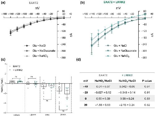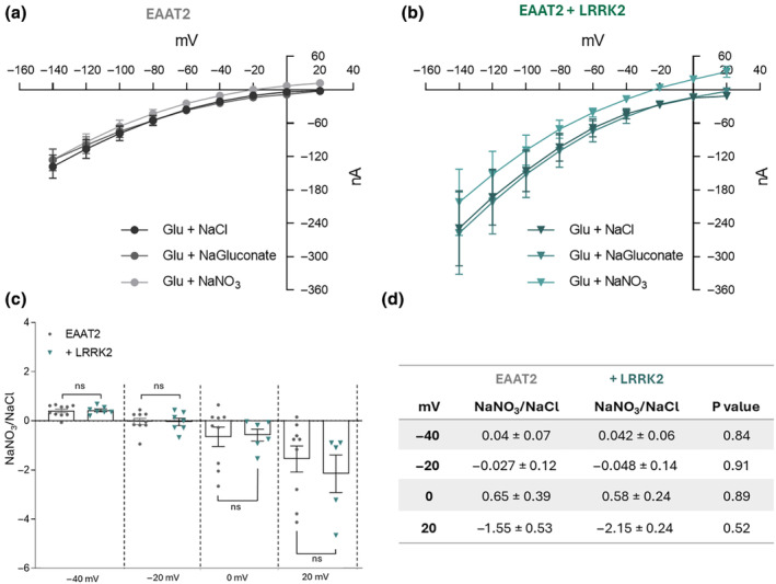 h = −60 mV. (d) Table of the ratio NaNO3/NaCl glutamate current in oocytes expressing EAAT2 with and without LRRK2. All values are shown as mean ± SEM, p‐values were obtained using Unpaired student t‐test.