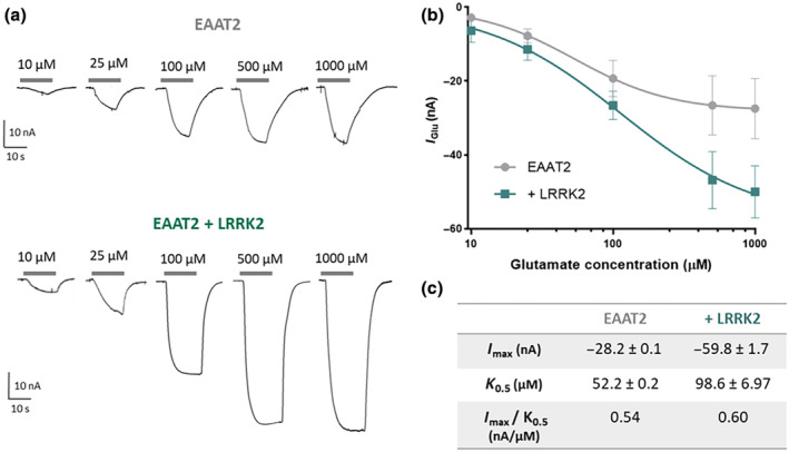 FIGURE 3. EAAT2 kinetic parameters in the presence of LRRK2. (a) Representative traces of concentration‐response in EAAT2. The transport current elicited by increasing glutamate concentration perfused (10, 25, 100, 500 μM, 1 mM) in oocytes expressing EAAT2 alone (top) and with LRRK2 (bottom). (b) Concentration‐response curve fitting with the logistic growth equation (EAAT2: n/N = 6/3; EAAT2 + LRRK2: n/N = 6/3). (c) Tabular presentation of the kinetic parameters I