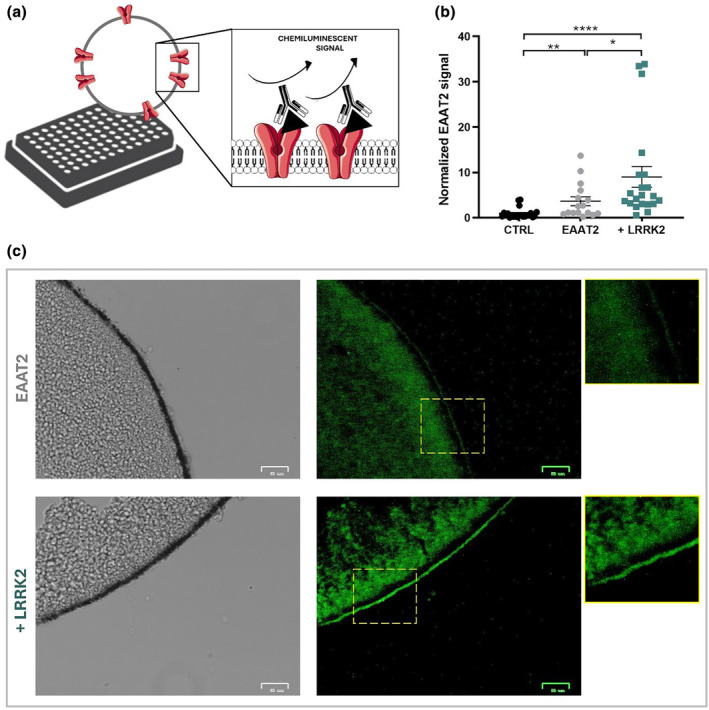 FIGURE 4. LRRK2 prompts EAAT2 membrane localization. (a) Schematic outline of SOC protocol. The antibody against EAAT2 detects the amount of transporter at the plasma membrane. (b) Scatter plot shows the quantification of EAAT2 chemiluminescent signal in oocytes injected with EAAT2 alone (n/N = 16/3) and co‐injected with LRRK2 (n/N = 21/3). Data were normalized on non‐injected oocytes used as internal control (n/N = 22/3). (c) Representative bright‐field (left column) or fluorescence (ex480‐517; right column) images of oocyte slices expressing EAAT2 alone (green signal) or with LRRK2; scale bar 25 μm.