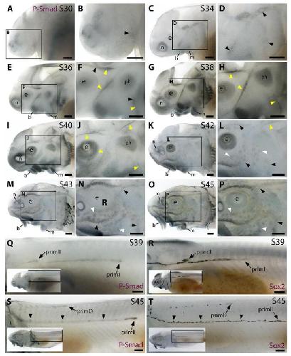 plus primII (R). At stage 45 (S,T), pSMAD1/5/9 immunoreactivity is seen in primD and primII plus a