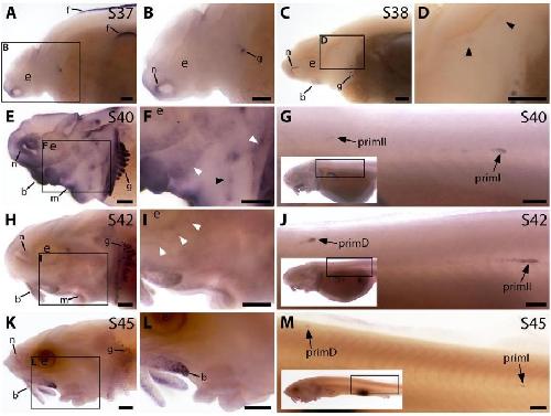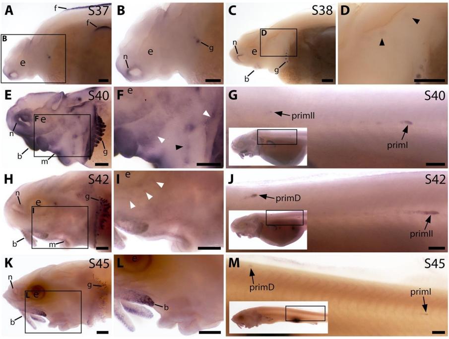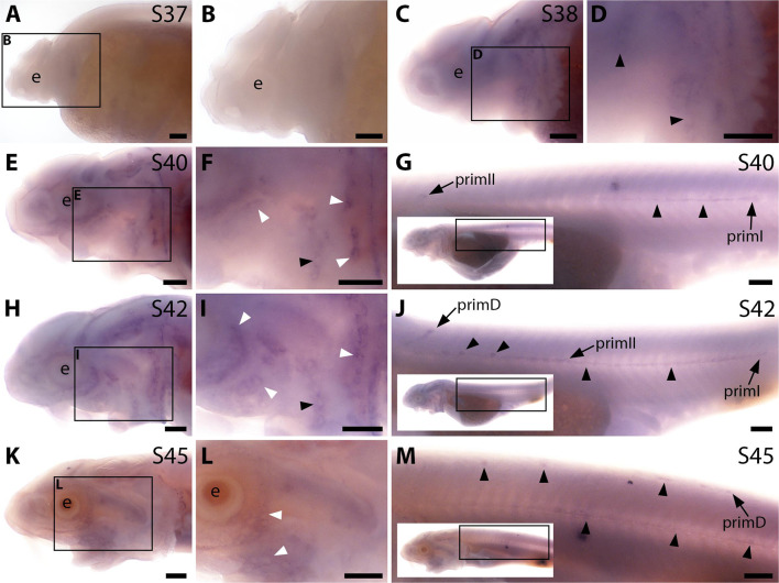 Figure 3—figure supplement 2. Sterlet Sostdc1 is expressed in neuromasts but only transiently in ampullary organs.In situ hybridisation in sterlet for Sostdc1, encoding a secreted dual Wnt/Bmp antagonist. Black arrowheads indicate examples of developing neuromasts; white arrowheads indicate examples of developing ampullary organs. For trunk images, boxes on low-power insets delineate the regions shown. Non-lateral line expression is seen in developing gill filaments. (A–D) Sostdc1 expression is seen in neuromasts on the head from stage 36 (A,B), persisting at stage 38 (C,D). (E–G) At stage 40, expression is maintained in neuromasts on the head (E,F) and is also visible in the three migrating lateral line primordia on the trunk and in trunk neuromasts (G). (H–J) At stage 42, Sostdc1 expression persists in cranial neuromasts and is now also seen in ampullary organs (H,I). On the trunk, expression persists in the migrating primordia and neuromasts (J). (K–M) By stage 45, only neuromast expression is observed on the head (K,L). On the trunk, expression continues in the migrating primordia and neuromasts (M). Abbreviations: e, eye; prim, migrating lateral line primordium (primI, primary; primII, secondary; primD, dorsal); S, stage. Scale bar: 250 μm. |