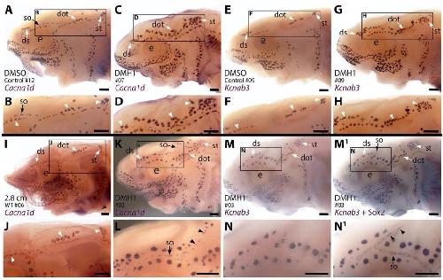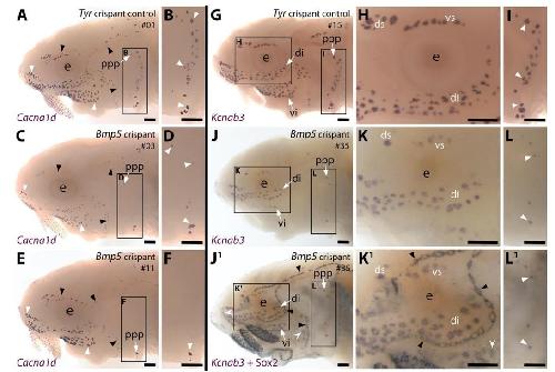 ampullary organs. The higher power view shows the posterior preopercular ampullary organ field. (C444 F) In Bmp5 crispants, Cacna1d expression reveals fewer ampullary organs (compare C,E with A); this