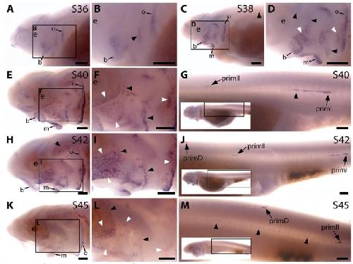 On the trunk, expression persists in the migrating primordia and neuromasts (J). (K-M) By stage 45,