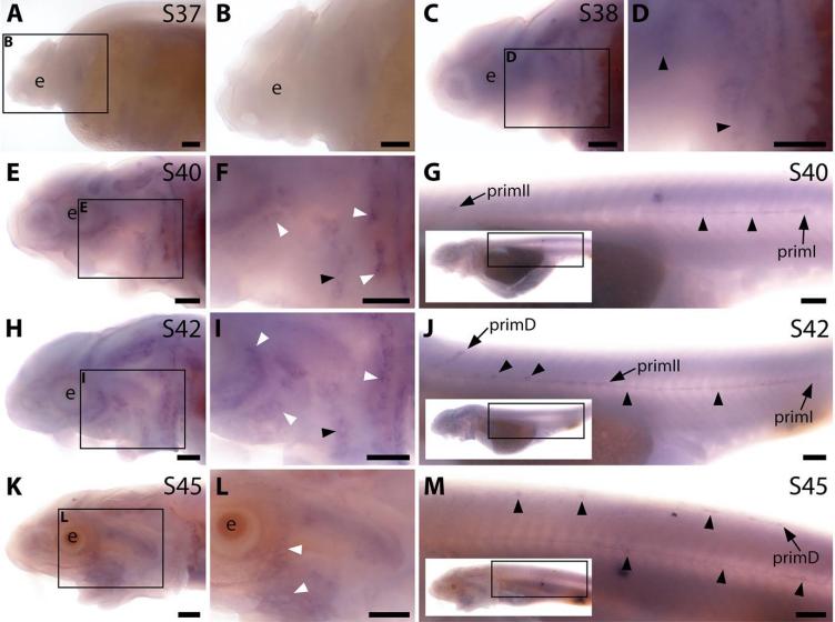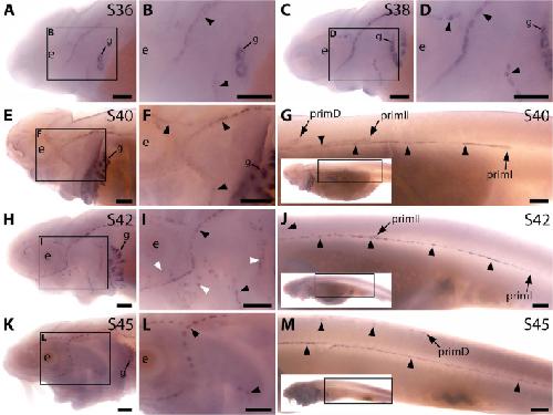 expression is seen in primD and primII (J). (K-M) At stage 45, no lateral line expression is seen on the