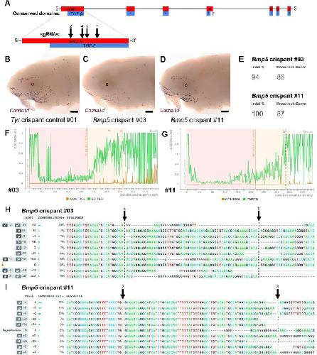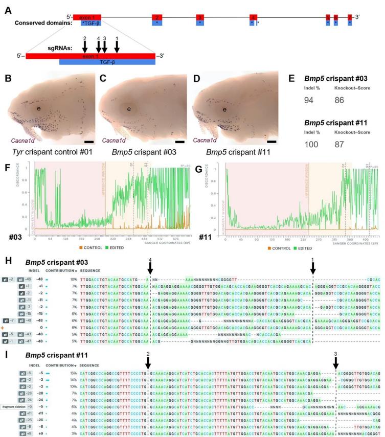 each of the Bmp5 crispants shown in panels C and D. ‘Indel %’ (E) gives the percentage of insertions