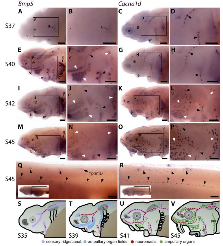 arrowheads indicate examples of developing ampullary organs. (A-D) At stage 37, Bmp5 expression