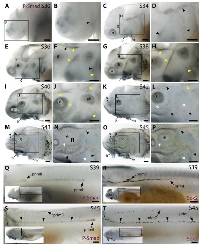 lateral line nerves. (A-P) Immunoreactivity on the head for phospho-SMAD1/5/9 (P-Smad) as a proxy for Bmp signalling activity. At stage 30 (A,B), weak immunoreactivity is seen in the region of the