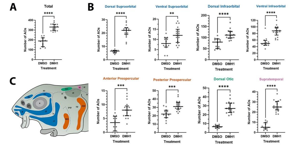 LLp (dorsal otic field); pink, supratemporal LLp (supratemporal field). DMH1-treated larvae have