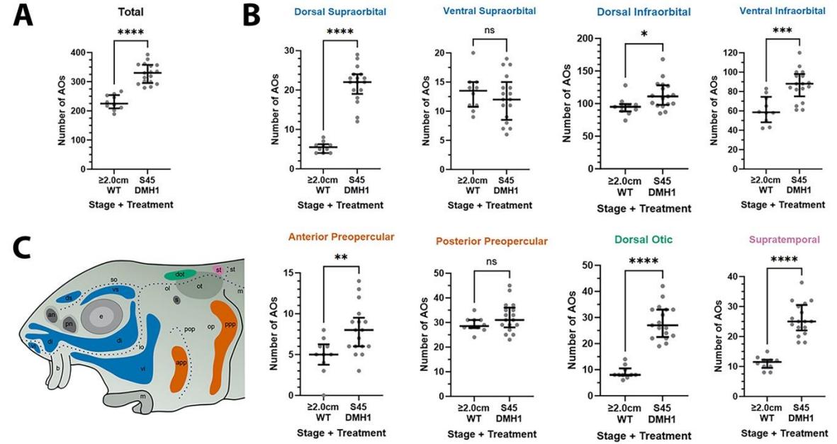 analysis. DMH1-treated larvae have significantly more ampullary organs overall at stage 45 than wild706 type older larvae (P<0.0001; A). In B, scatter plots are grouped with differently coloured titles