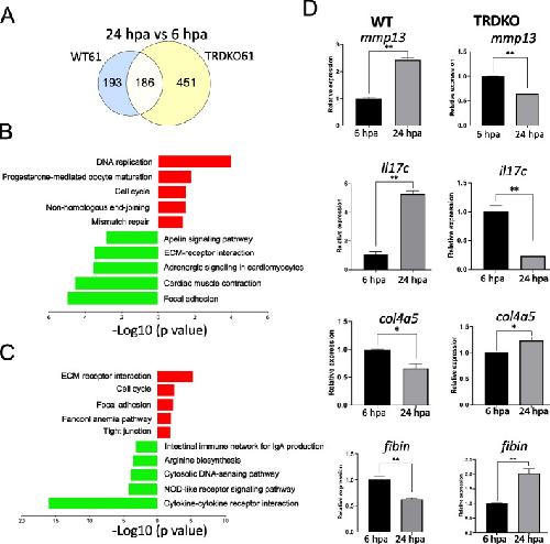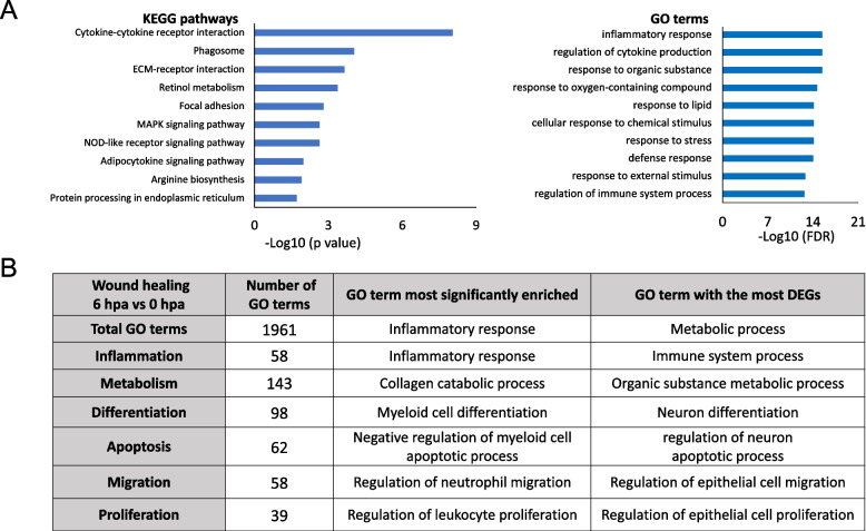 Fig. 2. KEGG and GO analyses reveal that conserved KEGG pathways/GO terms are regulated in wild-type and TRDKO tadpoles during wound healing. A Top 10 KEGG pathways/GO terms significantly enriched among the 243 DEGs common to all 4 groups (wild-type stage 56, wild-type stage 61, TRDKO stage 56 and TRDKO stage 61) during wound healing (6 hpa vs 0 hpa). Notably, the inflammatory response is the most significantly enriched pathways/terms. B The GO terms known to be involved in wounding healing were highly enriched among 243 DEGs common to all 4 groups
