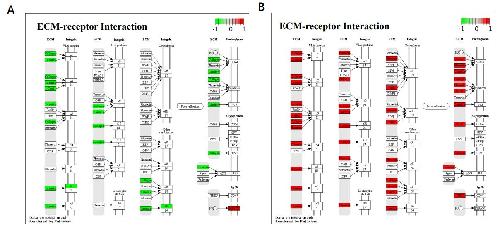 Fig. S3. The regulation of genes in the ECM-receptor interaction pathway in nonregenerative (A) and regenerative animals (B) during blastema