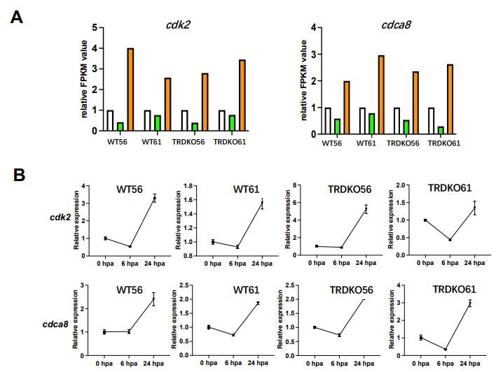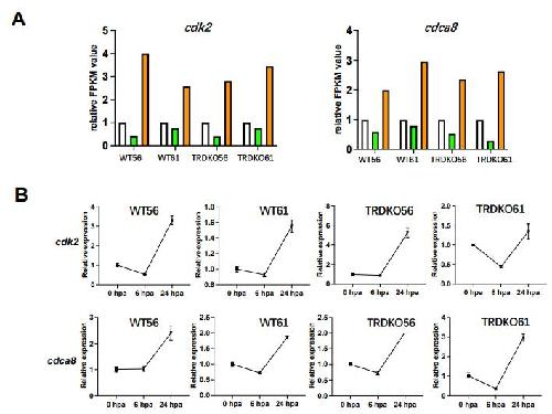 (B) The regulation of cdk2 and cdca8 was confirmed by RT-qPCR, normalized to that of rpl8. Note that both genes were