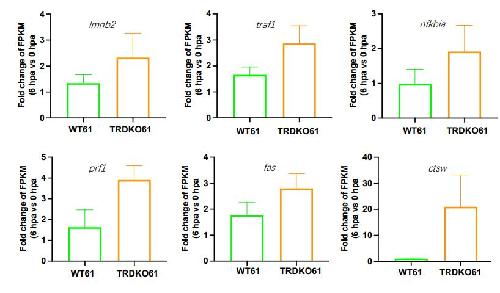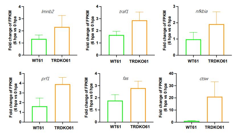 The expression of six genes involved in the apoptosis pathway, Imnb2, traf1, nfkbia, prf1, fas and ctsw, was shown as