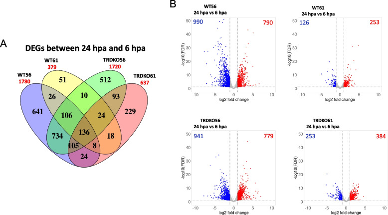 Fig. 1. Fewer differentially expressed genes (DEG) between 0 and 6 h postamputation (hpa) (the wound healing period) in the tail of wild-type tadpoles at the climax (stage 61) than in the other 3 groups of animals (wild-type at stage 56, TRDKO at stage 56 and TRDKO at stage 61). A Venn diagram of the DEGs identified in the wild-type and TRDKO tail at stage 56 and stage 61 during wound healing period. Note that there were 566 DEGs at wild-type stage 61 compared to 1162 DEGs at wild-type stage 56, 1171 DEGs at TRDKO stage 56 and 1134 DEGs at TRDKO stage 61. B Volcano plots showing the up (red)- and down (blue)-regulated DEGs in the wild-type and TRDKO tail at premetamorphosis (stage 56) and metamorphic climax (stage 61) during wound healing