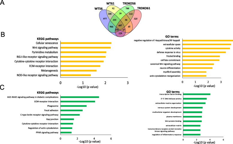 Fig. 5. KEGG and GO analyses reveal common and distinct KEGG pathways/GO terms regulated during the initial period of tail regeneration. A Venn diagram of all DEGs identified by pair-wise comparisons among 0 hpa, 6 hpa and 24 hpa tail samples of 4 groups after amputation. B 8 KEGG pathways and top 10 GO terms significantly enriched among the 92 DEGs specific to WT st61 (stage 61) tail. Note that the most significantly enriched KEGG pathway is cellular senescence. C 9 KEGG pathways and top 10 GO terms significantly enriched among the 370 DEGs common to WT st56, TRDKO st56 and TRDKO st61 tail. Note that development related pathways are significantly enriched