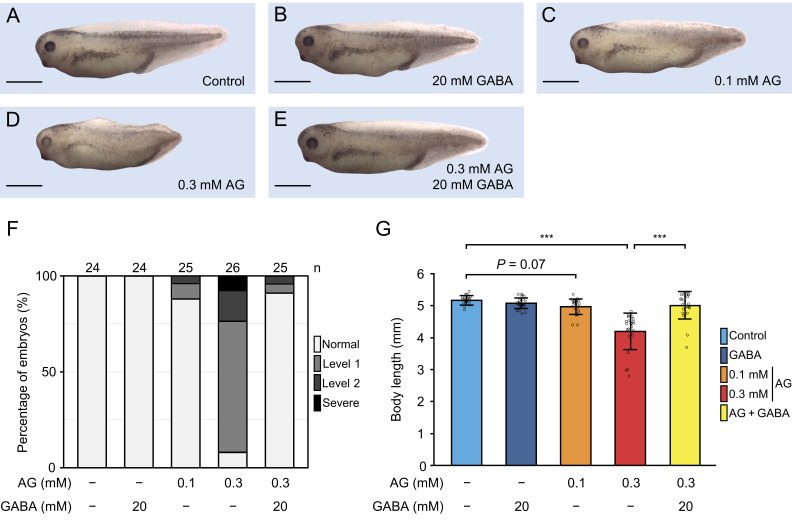 (A-E) Effects of AG and GABA treatments on embryos from St. 18 to 38. Scale bars: 1 mm. (A) Control embryo. (B) Embryo treated with 20 mM GABA. (C) Embryo treated with 0.1 mM AG. (D) Embryo treated with 0.3 mM AG. (E) Embryo treated with 0.3 mM AG and 20 mM GABA. (F) Quantification of AG-induced elongation inhibition. Embryos with body lengths ≥90% of the mean control length were classified as Normal, those with lengths between 75% and 89% as Level 1, and those <75% as Level 2. (G) Body lengths of St. 38 embryos. Data are presented as mean ± SD, with all measurements plotted. Statistical analyses were performed using one-way ANOVA followed by Tukey’s test. ***