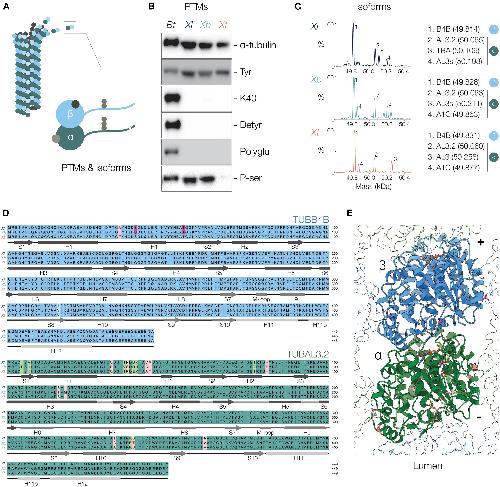 (A) Microtubules can be composed of different tubulin isoforms and can carry posttranslational modifications (PTMs).