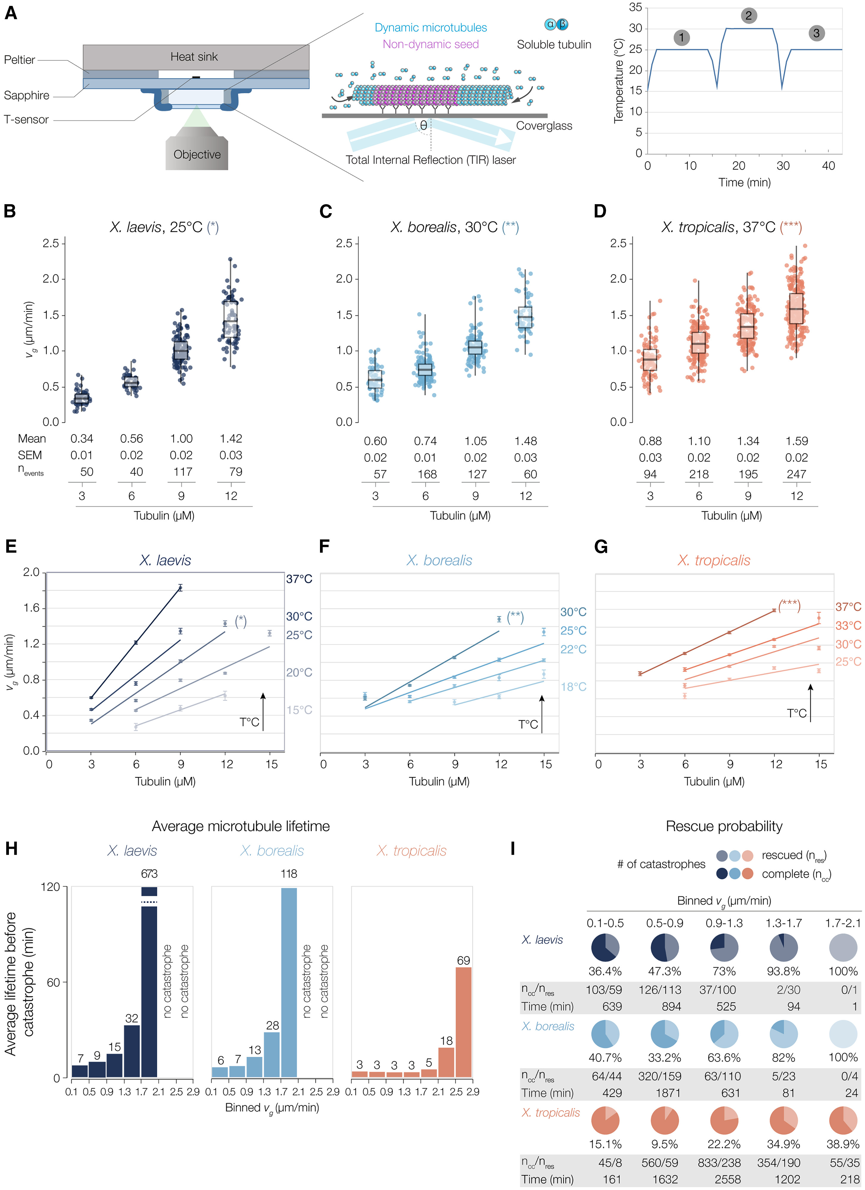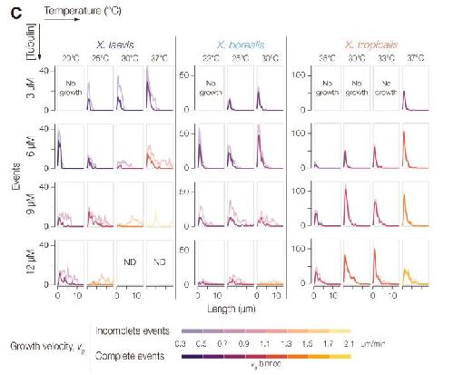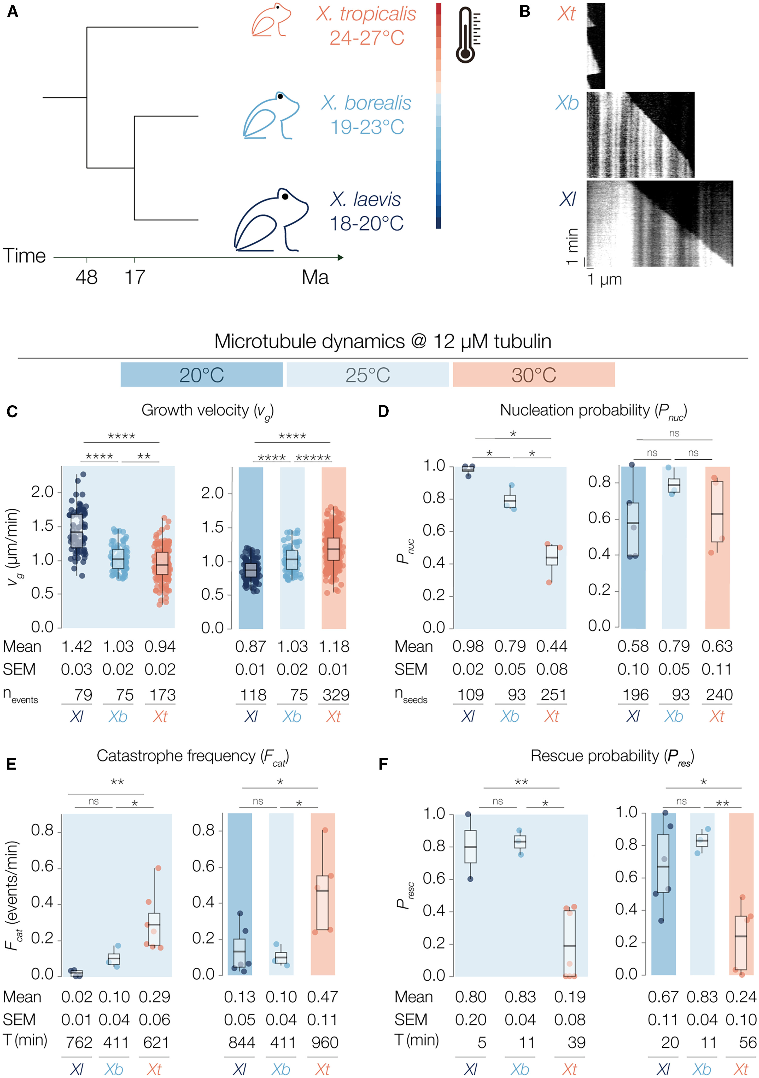 Figure 1. Tubulin orthologs in closely related Xenopus species evolved to exhibit comparable polymerization velocities but significantly different catastrophe frequencies and rescue probabilities at divergent thermal niches