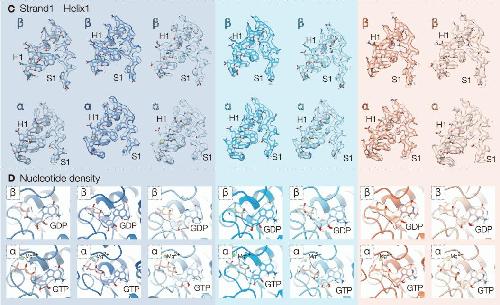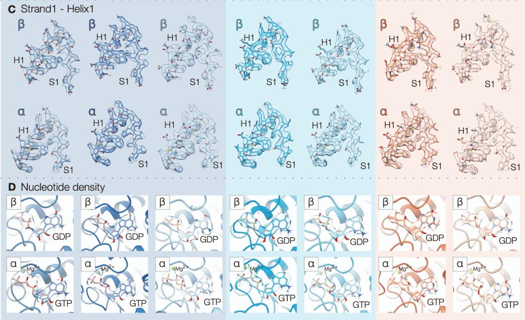 improvements in density quality (top), discrimination between α- and β-tubulin (middle,