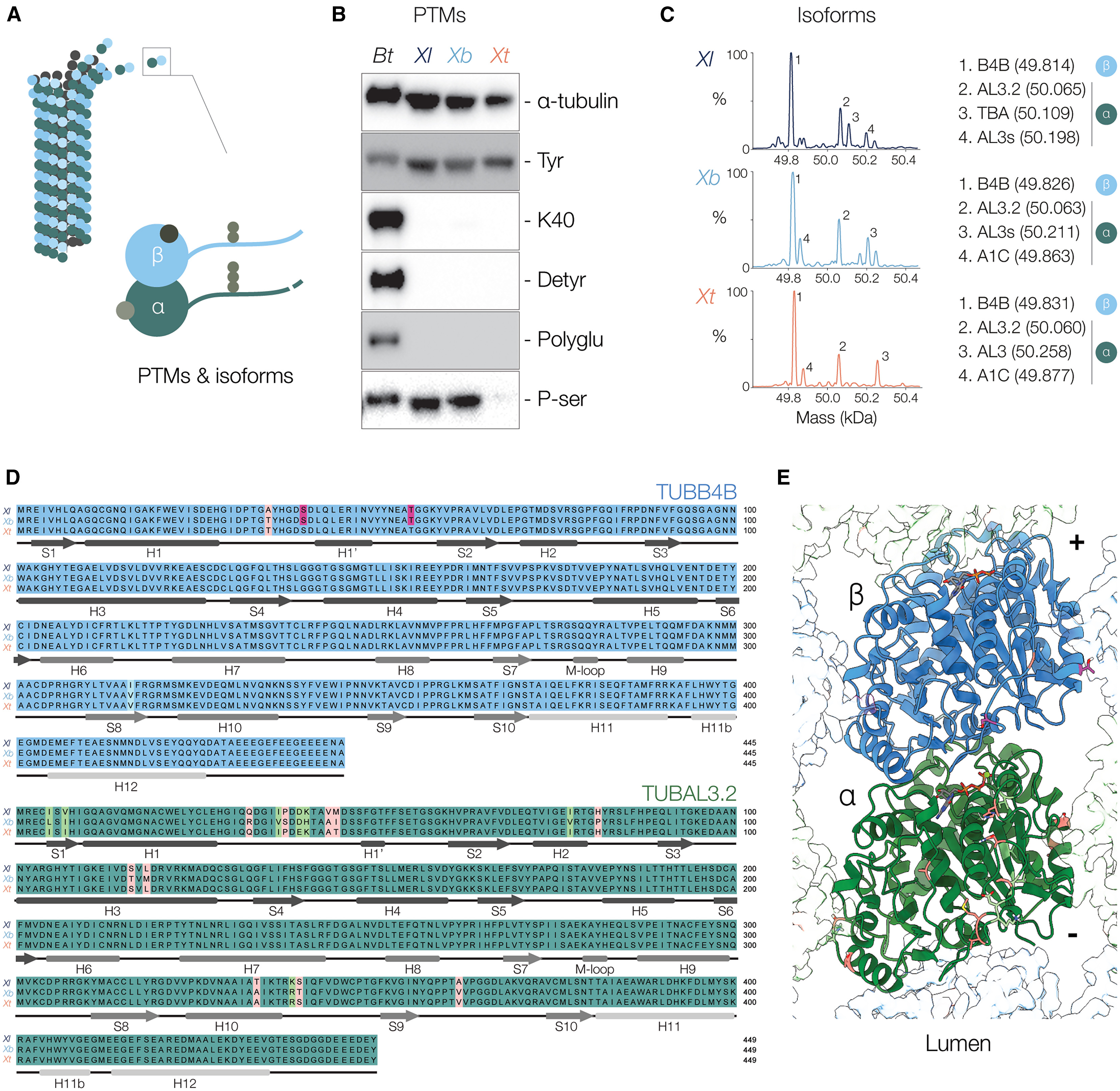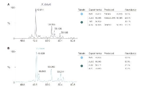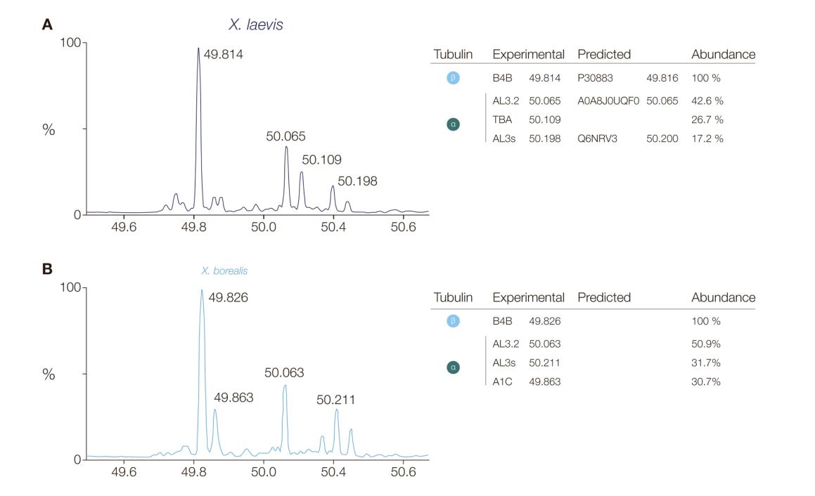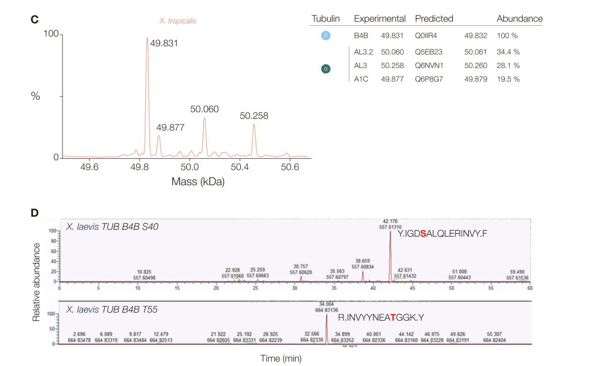 (C) Deconvoluted mass spectra of purified Xenopus tubulins. Measured average masses of the most abundant signals and corresponding tubulin isoforms.