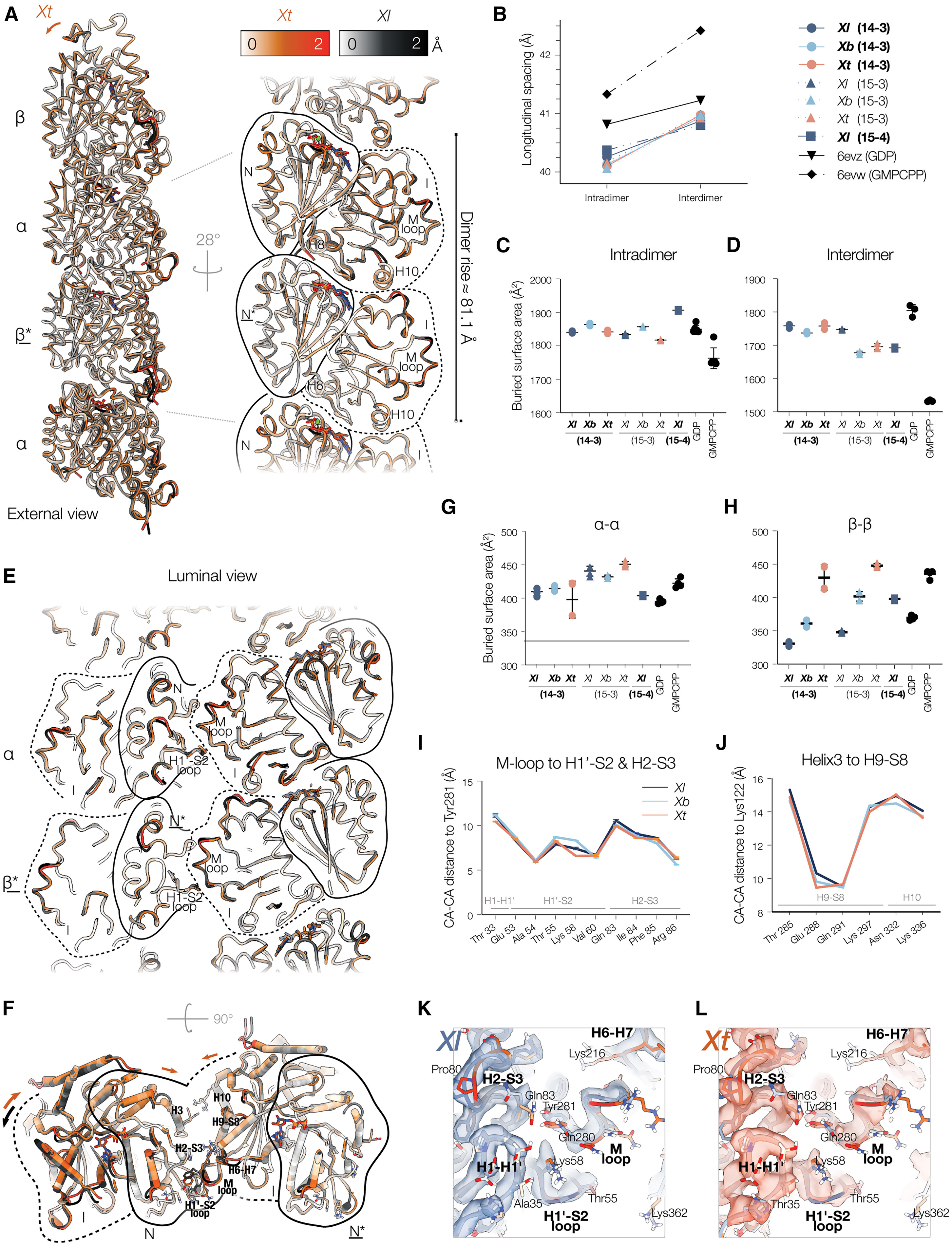 (G and H) Total α-α tubulin (C) and β-β interdimer (D) lateral protein-protein interface areas calculated for all Xenopus models compared with porcine tubulin models in two different nucleotide states as in (B)(D). Determined by PISA analysis (M&M).47