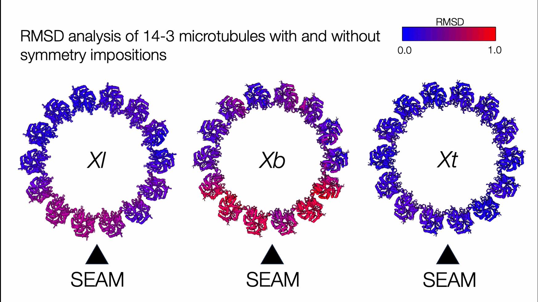Video S1. Complete microtubule lattice distortion analysis, related to Figure 5. RMSD representations of complete 14 protofilament 3-start microtubule lattice models constructed from symmetrized and non-symmetrized cryo-EM density (frames alternate between the two models). A higher RMSD value (red) indicates a higher level deviance between the aligned microtubule particles and the perfectly cylindrical reconstructions generated through application of symmetry restraints. Higher deviance (red) reflects higher levels of lattice distortion within the data from each species.