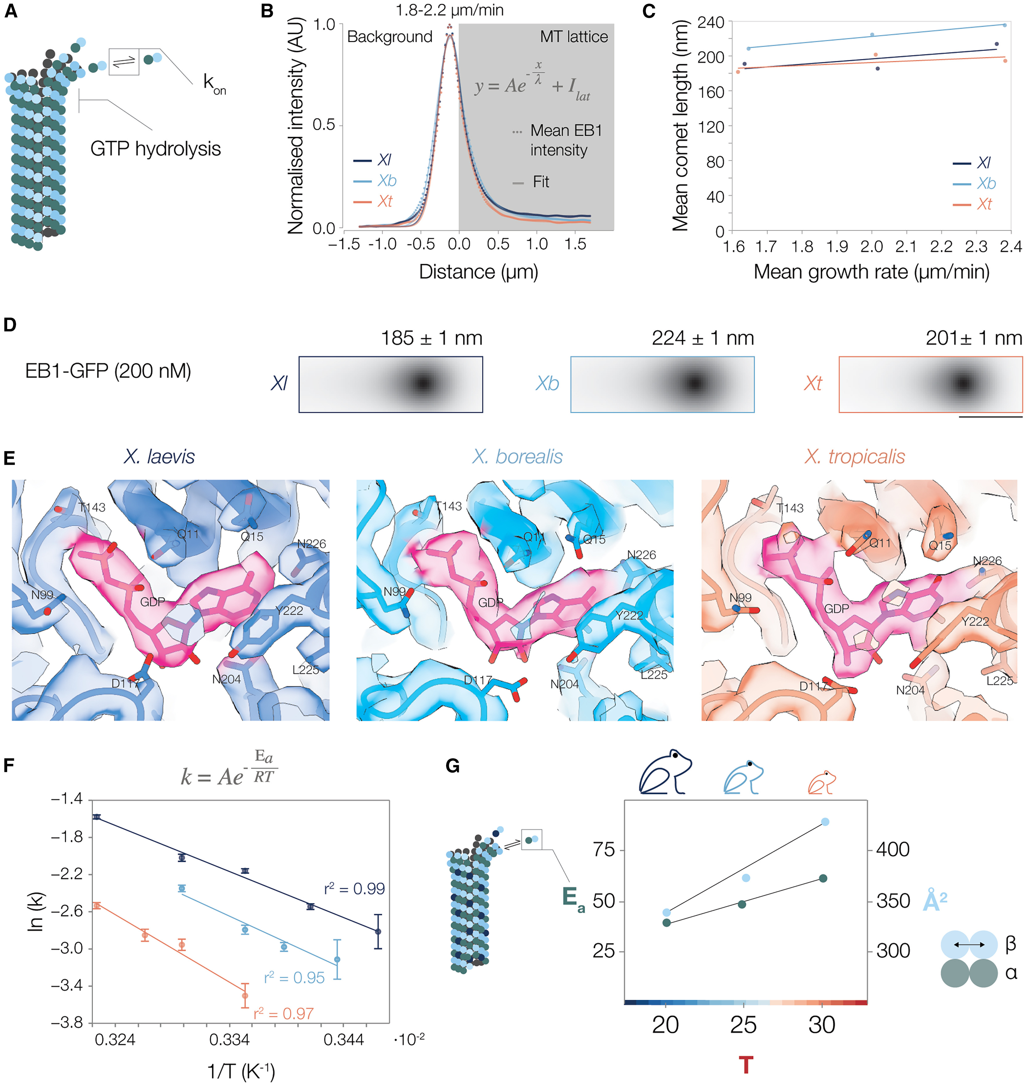 (B–D) Analysis of EB1-GFP profiles from microtubules growing at 25°C, with 200 nM EB1-GFP and tubulin concentration 12 μM for Xl, 11–15 μM for Xb, and 25–28 μM for Xt to adjust for similar growth velocities.