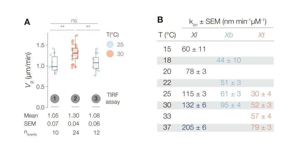(C) At 25°C, Xl microtubules grow at 1.42 ± 0.03 μm/min, Xb at 1.03 ± 0.02 μm/min, and Xt at 0.94 ± 0.02 μm/min, with p value(Xl,Xb) < 0.0001, g(Xl,Xb) = 1.53; p value(Xb,Xt) = 0.01, g(Xb,Xt) = 0.38; p value(Xl,Xt) < 0.001, g(Xl,Xt) = 1.84. Right graph: at 20°C, Xl microtubules grow at 0.87 ± 0.01 μm/min, 25°C, Xb at 1.03 ± 0.02 μm/min, and 30°C, Xt at 1.18 ± 0.01 μm/min, with p value(Xl,Xb) < 0.0001, g(Xl,Xb) = 0.94; p value(Xb,Xt) < 0.0001, g(Xb,Xt) = 0.67; p value(Xl,Xt) < 0.0001, g(Xl,Xt) = 1.40.