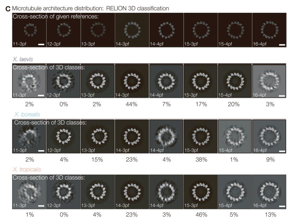 (D) Distribution of microtubule protofilament number for all three species determined by 2D and 3D classification.