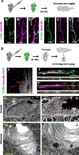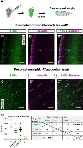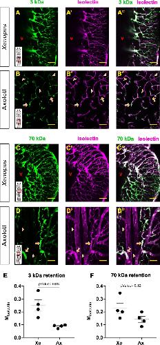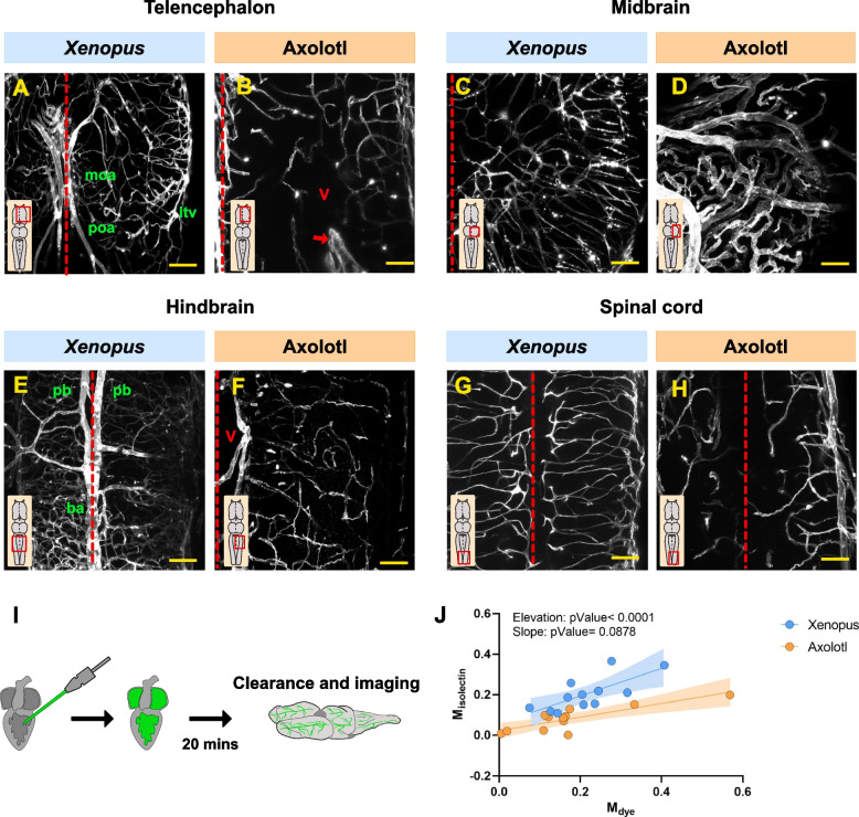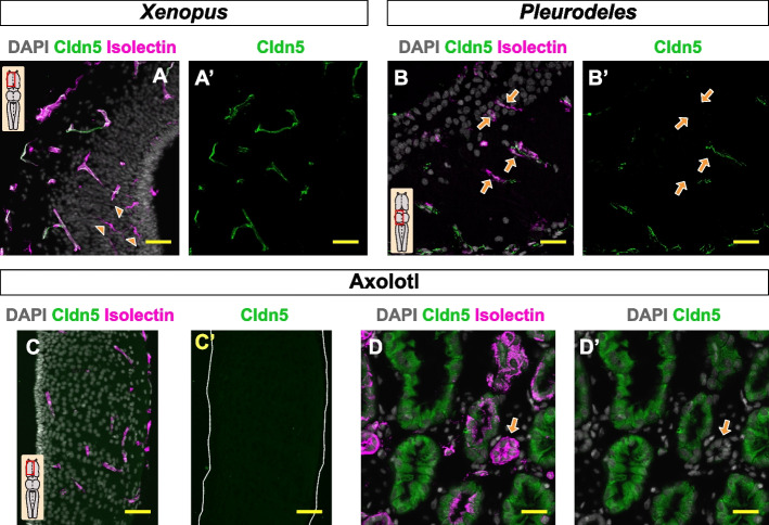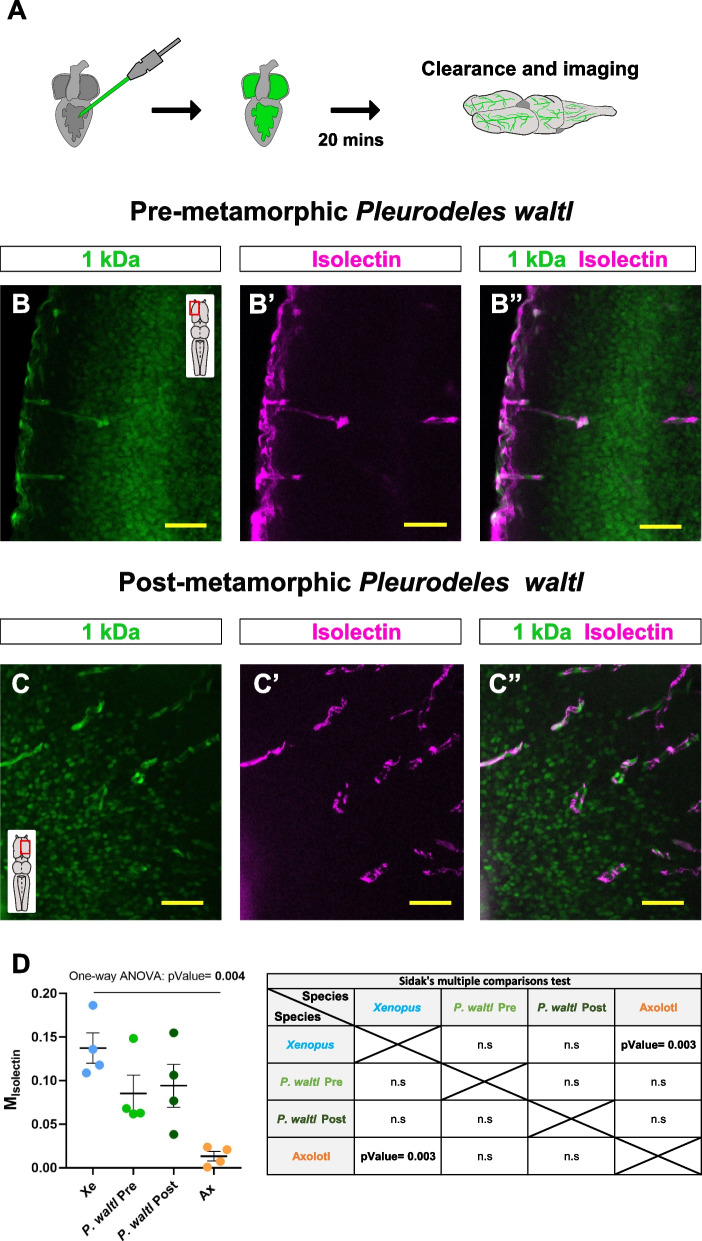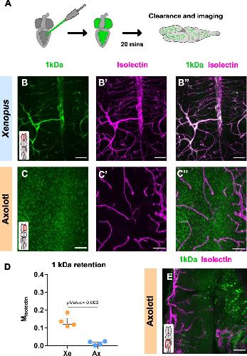 BACKGROUND: The blood-brain barrier (BBB) is a semipermeable interface that prevents the non-selective transport into the central nervous system. It controls the delivery of macromolecules fueling the brain metabolism and the immunological surveillance. The BBB permeability is locally regulated depending on the physiological requirements, maintaining the tissue homeostasis and influencing pathological conditions. Given its relevance in vertebrate CNS, it is surprising that little is known about the BBB in Amphibians, some of which are capable of adult CNS regeneration. RESULTS: The BBB size threshold of the anuran Xenopus laevis (African clawed toad), as well as two urodele species, Ambystoma mexicanum (axolotl) and Pleurodeles waltl (Iberian ribbed newt), was evaluated under physiological conditions through the use of synthetic tracers. We detected important differences between the analyzed species. Xenopus exhibited a BBB with characteristics more similar to those observed in mammals, whereas the BBB of axolotl was found to be permeable to the 1 kDa tracer. The permeability of the 1 kDa tracer measured in Pleurodeles showed values in between axolotl and Xenopus vesseks. We confirmed that these differences are species-specific and not related to metamorphosis. In line with these results, the tight junction protein Claudin-5 was absent in axolotl, intermediate in Pleurodeles and showed full-coverage in Xenopus vessels. Interestingly, electron microscopy analysis and the retention pattern of the larger tracers (3 and 70 kDa) demonstrated that axolotl endothelial cells exhibit higher rates of macropinocytosis, a non-regulated type of transcellular transport. CONCLUSIONS: Our study demonstrated that, under physiological conditions, the blood-brain barrier exhibited species-specific variations, including permeability threshold, blood vessel coverage, and macropinocytosis rate. Future studies are needed to test whether the higher permeability observed in salamanders could have metabolic and immunological consequences contributing to their remarkable regenerative capacity.