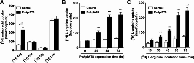 Fig. 2. PvApiAT8-mediated uptake of L-arginine. (A) The uptake rates of radiolabeled amino acids were measured in water-injected (control) oocytes and oocytes expressing PvApiAT8 over a 1-hour period. The concentrations of the incubated amino acids were as follows: [3H] L-arginine at 100 nM, [3H] L-glutamine at 100 nM, [3H] L-glycine at 100 nM, and [3H] L-leucine at 100 nM. (B) The uptake of 100 nM [3H] L-arginine in PvApiAT8-expressing oocytes was assessed at various expression times (0–72 h). (C) The uptake of 100 nM [3H] L-arginine in both control and PvApiAT8-expressing oocytes was measured at 15-minute intervals, extending up to 75 min. Significant differences are indicated by double asterisks (p < 0.01) and triple asterisks (p < 0.001). Data are presented as the mean ± S.E., n = 8–10.