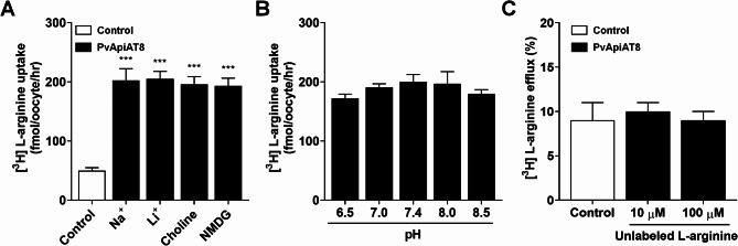 Fig. 3. The transport properties of L-arginine via PvApiAT8. (A) The effect of extracellular cation ions on [3H] L-arginine uptake in PvApiAT8-expressing oocytes. The uptake rate of [3H] L-arginine (100 nM) was measured in the presence or absence of extracellular Na+. Extracellular Na+ was replaced with equimolar concentrations of lithium (Li+), choline, and NMDG (N-methyl-d-glucosamine). (B) Various extracellular pH conditions affected the uptake level of [3H] L-arginine (100 nM). Specifically, both low and high pH significantly reduced the uptake of [3H] L-arginine (100 nM) via PvApiAT8. Statistical analysis was performed using Student’s t-test to compare results with the pH 7.4 group, which represents neutral conditions. (C) The lack of a trans-stimulatory effect of L-arginine on PvApiAT8-mediated efflux of [3H] L-arginine was observed. Oocytes expressing PvApiAT8 were incubated with 100 nM [3H] L-arginine for 90 min, and washed oocytes were transferred to ND96 solution (control) or ND96 containing 10 µM or 100 µM unlabeled L-arginine. The efflux amount of L-arginine during 1 h was expressed as the percentage of the preloaded amount. All results are presented as mean ± S.E. (n = 6–8).