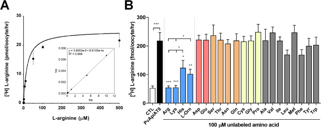 Fig. 4. Kinetics of PvApiAT8-mediated uptake of [3H] L-arginine and amino acid selectivity of PvApiAT8. (A) The uptake rates of [3H] L-arginine by control (water-injected) or PvApiAT8-expressing oocytes were measured for 1 h at varying concentrations (mean ± S.E.; n= 6–8). The inset shows a Lineweaver-Burk analysis of the concentration-dependent uptake of [3H] L-arginine. “υ” representing velocity and “S” representing the concentration of L-arginine. (B) Uptake assays with [3H] L-arginine were performed in the presence of various amino acids. Statistical analysis compared [3H] L-arginine uptake in PvApiAT8-expressing oocytes to both control (CTL) and cationic amino acids, as well as comparisons among the cationic amino acids. Significant differences are denoted by one asterisk (p < 0.05), two asterisks (p < 0.01), or three asterisks (p < 0.001).