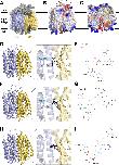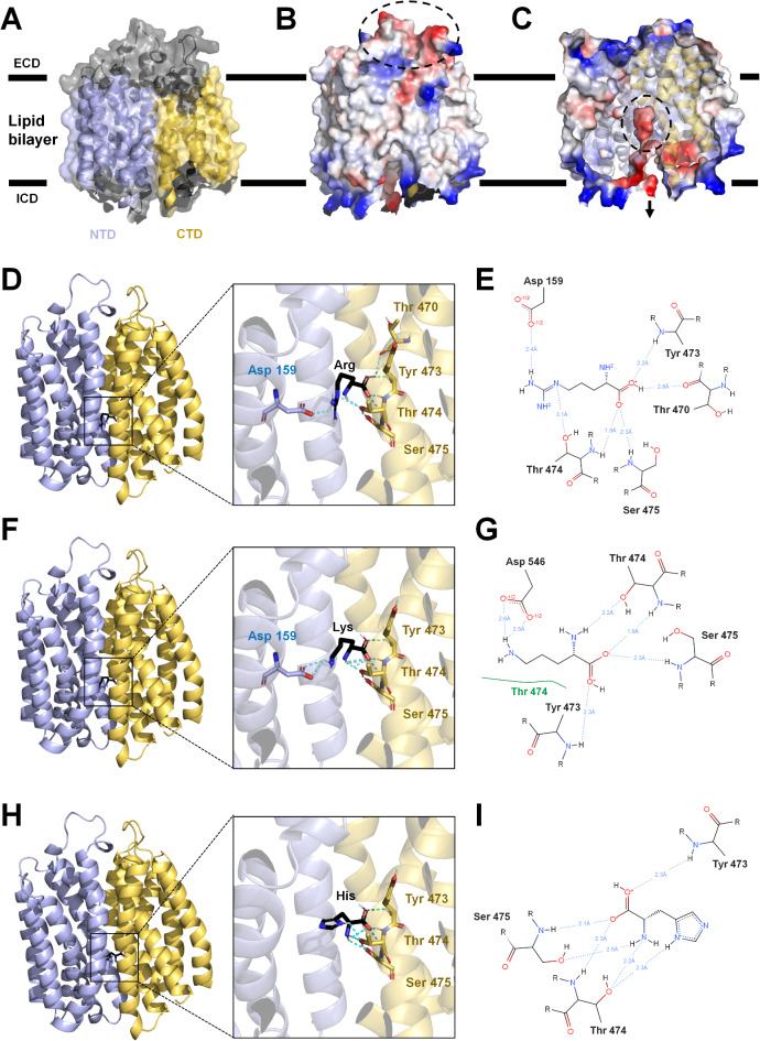 Fig. 5. The binding mode of cationic amino acids in PvApiAT8. (A) The transmembrane region of PvApiAT8, shown as a surface representation, highlighting the N-terminal domain (NTD, light blue) and C-terminal domain (CTD, yellow), excluding the long loop spanning region (amino acids 250–354). The gray areas represent non-transmembrane regions. ECD refers to the extracellular domain, and ICD to the intracellular domain. (B) The surface view of the electric potential of PvApiAT8, with dash-dot lines circle indicating a negatively charged region that may bind cationic amino acids from the extracellular side. (C) The internal view of the electric potential of PvApiAT8, where the dash-dot lines circle show a cationic amino acid binding pocket with a strongly negatively charged region. The lower area also shows a negatively charged, channel-like structure. (D) The binding mode of L-arginine with PvApiAT8 is represented in a 3D model, and (E) in a 2D view. (F) The binding mode of L-lysine with PvApiAT8 is represented in a 3D model, and (G) in a 2D view. (H) The binding mode of L-histidine with PvApiAT8 is represented in a 3D model, and (I) in a 2D view.
