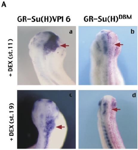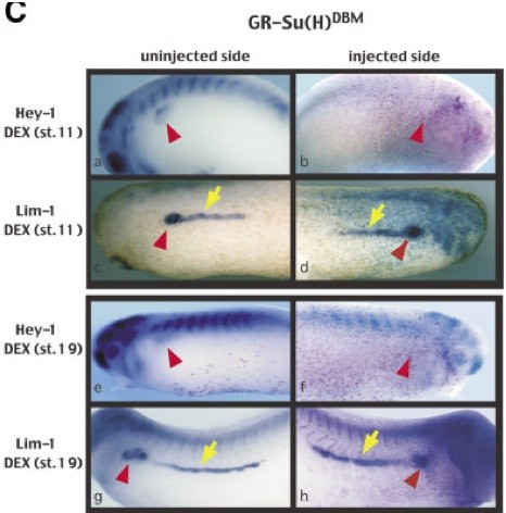 Fig. 4. Xenopus orthologue of the hairy related gene (XHey-1) is responsive to Notch signaling in the developing brain and pronephros. Embryos were injected with either GR-Su(H)VP16, GR-NotchICD, or GR-Su(H)D B M and induced with dexamethasone either early (between stages 11 and 13) or late (between stages 15 and 19). Injected embryos were cultured, fixed between stages 24 and 30, and processed for in situ hybridization. A: In the developing brain, XHey-1 is responsive to Notch signaling (between stages 11 and 19) independently of when signaling is perturbed. Activation of Notch signaling increases expression of XHey-1 on the injected side of the head [dark orange arrows; a,c; also see 4B (i,j)], whereas suppression of Notch signaling decreases expression of XHey-1 on the injected side of the embryo (dark orange arrows; b,d). B,C: In the pronephros, XHey-1 is responsive to Notch signaling; however, this responsiveness is sensitive to the time of induction of the injected con-