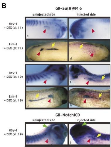 Fig. 4. Xenopus orthologue of the hairy related gene (XHey-1) is responsive to Notch signaling in the developing brain and pronephros. Embryos were injected with either GR-Su(H)VP16, GR-NotchICD, or GR-Su(H)D B M and induced with dexamethasone either early (between stages 11 and 13) or late (between stages 15 and 19). Injected embryos were cultured, fixed between stages 24 and 30, and processed for in situ hybridization. B: Early activation of Notch signaling decreased both the expression of Lim-1 throughout the entire pronephric field (c,d) as well as the expression of Hey-1 (a,b). Activation of Notch signaling later, after the establishment of the initial Lim-1 pronephric field, decreases expression of only the duct domain of Lim-1 (g,h) while expanding the anterior expression of XHey-1 (c,d, and i,j). |