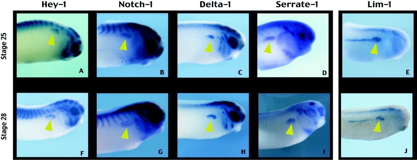 Figure 2. Xenopus orthologue of the hairy related gene (XHey-1) is expressed in the developing pronephric field in an overlapping pattern with other components of the Notch signaling pathway. The expression of Hey-1 is shown at stages 25 and 28 (A,F), and compared with both the expression of other components of the Notch signaling pathway (B-D,G-I) and with the pronephric anlage marker Lim-1 (E,J). Note that all four components of the Notch pathway shown here are expressed in an overlapping pattern, and this pattern is restricted to only the anterior-dorsal portion of the Lim-1 domain. This is the region of the pronephric anlage fated to contribute to the tubules. In all panels, embryos are viewed laterally with the anterior to the right. |