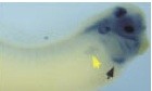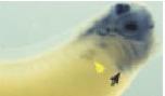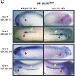 Figure 3. Later expression of the Xenopus orthologue of the hairy related gene (XHey-1) in comparison to Notch-1 and Serrate-1. XHey-1 expression persists in the somites (red arrows), head, eyes, and branchial arches of tadpole stage embryos shown from stages 32 to 35 (C,F,I). At this time, XHey-1 is also expressed in the heart (black arrows). Expression of Notch-1 and Serrate-1 is shown for comparison (A,B,D,E,G,H). Note that XHey-1 is expressed in a pattern largely overlapping that of Notch-1 and Serrate-1 in many tissues. However, unlike XHey-1, Notch-1, and Serrate-1 are expressed in the developing pronephros at this time (yellow arrows). In all panels, embryos are viewed laterally, with anterior to the right. |