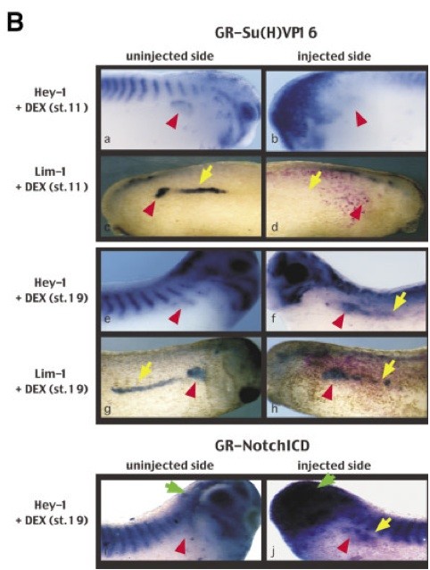 structs. These results can be compared with analysis of Lim-1 expression after perturbation of Notch signaling. Yellow and red arrows mark do- mains of the pronephric field (red tubule region, yellow duct region). Green arrows mark XHey-1 expression in the head region. |
