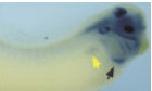 Figure 1. Early expression of the Xenopus orthologue of the hairy related gene (XHey-1). Lateral (A,C,E,G) and dorsal (B,D,F,H) views of XHey-1 expression in tail bud and early tadpole stage embryos assayed by in situ hybridization. Anterior is to the right in all panels. A-F: In stage 22-28 embryos, expression is observed in the developing pronephros (yellow arrows and arrowheads), somites (red arrows and arrowhead), eyes, branchial arches, and in discrete regions of the brain (orange arrows and arrowheads). G,H: This expression pattern persists through stage 31. A notable exception occurs in the pronephros where XHey-1 expression decreases substantially at later stages and is subsequently not detectable in this tissue, despite robust expression elsewhere in the embryo. |
