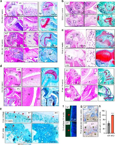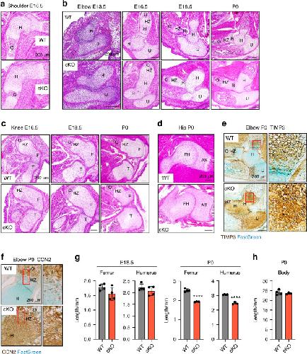 Fig. 2. Conditional deletion of Lrp1 in skeletal progenitors impairs early bone and joint formation. Representative images of H&E staining of E16.5 shoulder (a), E13.5-P0 elbow (b), E16.5-P0 knee (c) and P0 hip (d) sections of WT and Lrp1flox/flox/Prrx1Cre homozygote conditional KO (cKO) mice. Scale bar, 200 µm. H, humerus; R, radius; U, ulna; HZ, hypertrophic zone; O, primary ossification centre; F, femur; FH, femur head; T, tibia; AS, acetabulum socket. e and f, Representative images of immunohistochemical staining of TIMP3 (e) and CCN2 (e) and fast green counterstaining in E16.5 knee sections of WT and cKO mice. Regions delineated by the red squares in the panels have been magnified in the right panels. Scale bar, 200 µm. g and h, Length of femur and humerus mineralised bone (g) and body (h) of E18.5 (g) and P0 (gand h) WT and cKO mice. Circles represent individual mice and bars show the mean ± SD. P values were evaluated by 2-tailed Student’s t test. ****P < 0.000 1 |
