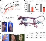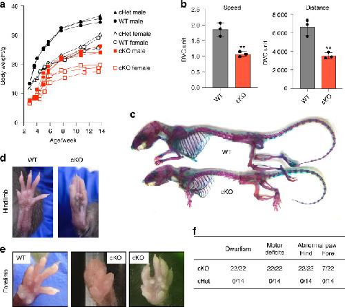 Fig. 3. LRP1 deficiency in skeletal progenitors results in dwarfism, impaired mobility and fore/hind limb malformation. a Mouse weight measurement from 3-14 weeks after birth. Closed (male) and open (female) black circles (WT), black triangles (cHet; Lrp1flox/wt/Prrx1Cre heterozygote conditional KO), and red squares (cKO; Lrp1flox/flox/Prrx1Cre homozygote conditional KO) represent individual mice. b Total distance and average speed of WT and cKO mice. Locomotor activity of 6-week-old mice measured by the continuous automated home-cage monitoring system for 4 weeks. Circles represent individual mice and bars show the mean ± SD. **P < 0.01 by 2-tailed Student’s t test. c Whole-mount skeletal staining of 14-week-old mice with Alcian blue and Alizarin red. d Photographs of 8-week-old WT and the cKO hind paws. e Photographs of 8-14-week-old WT and the cKO fore paws. f Table showing the frequencies of the identified phenotypes |