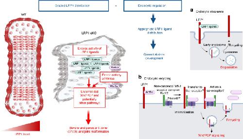 Fig. 9. A novel and critical role for LRP1 in skeletal development and its deficiency in emergence of skeletal pathologies. Skeletal progenitor LRP1 is likely to have at least two different functions: to remove molecules from extracellular milieu and degrad them intracellularly (a), and to capture, recycle and distribute molecules (b). Combination of graded distribution of LRP1 and LRP1-mediated endocytosis regulates distribution of extracellular signalling molecules. This provides a novel mechanism for appropriate distribution of extracellular signalling molecules to ensure that bone and joint form correctly. Thus, loss of LRP1 leads to excess activity of some of LRP1 ligands and erratic Wnt/PCP signalling, resulting in severe defects in multiple bones and joints. Illustration created with BioRender (https://biorender.com) |