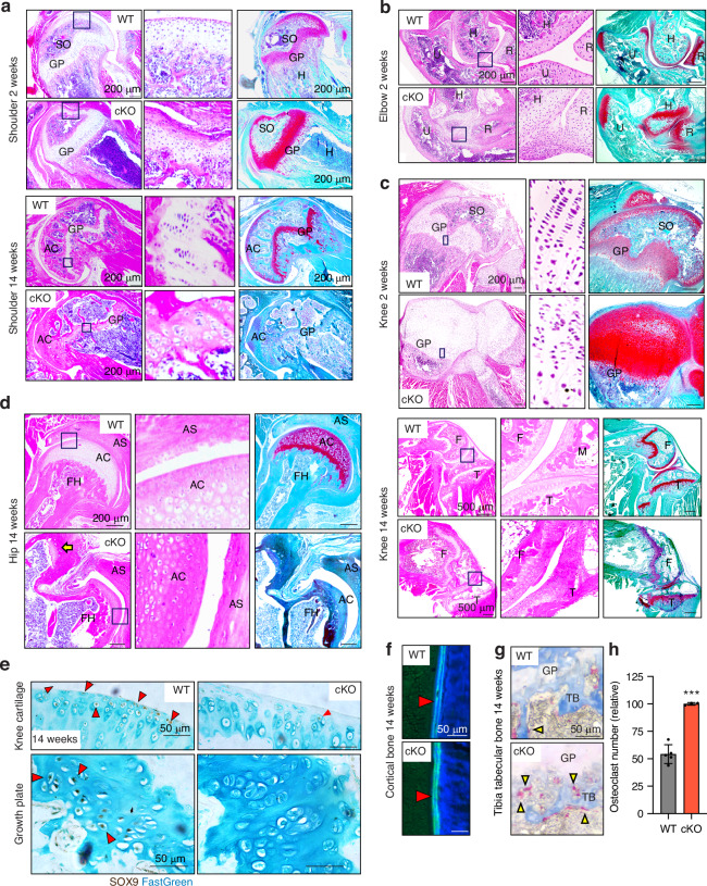 (cKO) mice. Arrow indicates the extra groove of femoral heads (d). Regions delineated by the dark blue squares in the panels have been magnified in the right panels. Scale bar, 200 µm. GP, growth plate; AC, articular cartilage; F, femur; T, tibia; M, menisci. e, Representative images of immunohistochemical staining of SOX9 in knee articular cartilage and growth plate sections of 14-week-old WT and cKO mice. Arrow heads indicate cells with SOX9 positive staining. Scale bar, 50 µm. f Representative images of fluorescent microscopy analysis of calcein-double stained cortical bones in 14-week-old mice (n = 3 each). Red arrowheads indicate calcein double staining in cortical bone. Scale bar, 50 µm. g TRAP and aniline blue staining of tibia trabecular bone of 14-week-old mice. Yellow arrowheads highlight osteoclast staining. Scale bar, 50 µm. TB, trabecular bone; GP, growth plate. h Measurement of osteoclast numbers in WT and Lrp1flox/flox/Prrx1Cre (cKO) trabecular bones. Circles represent individual mice and bars show the mean ± SD. ***P < 0.001 by 2-tailed Student’s t test |