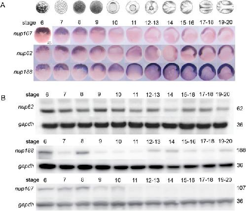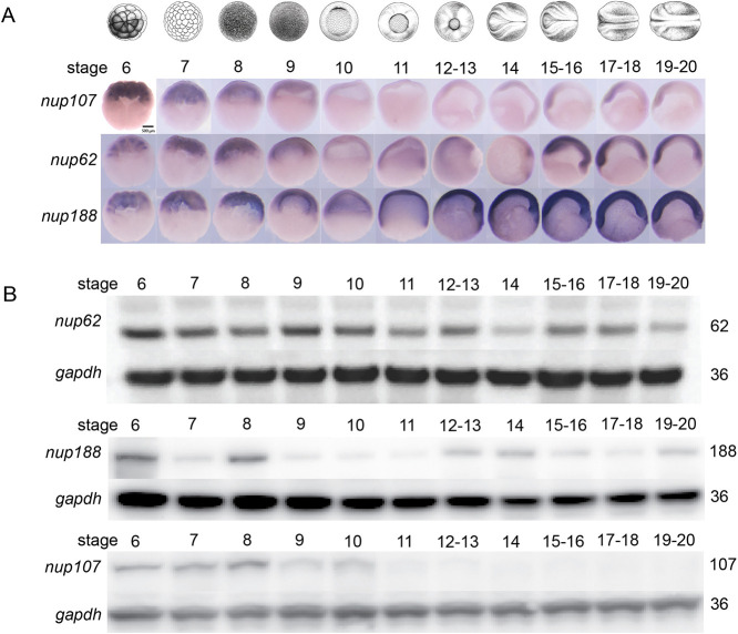 Fig. 1. Spatio-temporal patterns of nucleoporin expression. (A) mRNA expression domains of nup107, nup62, and nup188 detected by whole-mount in situ hybridization using antisense probes at different developmental stages (panel above). Scale bar: 500 μm. (B) Protein expression levels of Nup62, Nup188, and Nup107 detected by western blotting at different developmental stages (panel above). Gapdh is a loading control. Three biological replicates were used for all experiments, with 30 embryos used per stage per condition. All data represent results from experiments replicated at least three times in the laboratory.