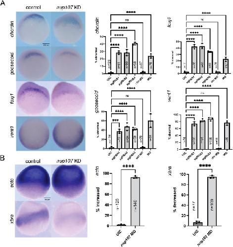 Fig. 2. Nup107 depletion alters germ layer specification. (A) Representative images of whole-mount in situ hybridization embryos at stage 10 demonstrating reduced expression levels of dorsal mesodermal markers (chordin, goosecoid, foxj1) and upregulated expression of a ventral mesodermal marker (vent1) due to Nup107 depletion. (B) Whole-mount in situ hybridization images of embryos at stage 10 showing upregulated ectodermal marker (ectodermin) and reduced mesodermal marker (xbra) expression in Nup107-depleted embryos. Three biological replicates were used for all experiments. All data represent results from experiments replicated at least three times in the laboratory. Statistical significance was determined using two-way ANOVA analysis. ***P<0.001, ****P<0.0001. ns, not significant. Data are mean±s.d. Scale bars: 500 μm.
