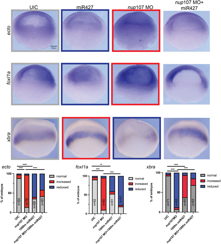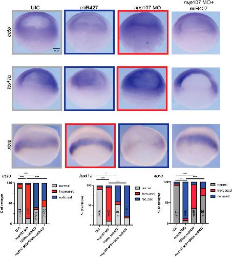 Fig. 5. miR427 overexpression rescues germ layer expression patterns associated with nup107 depletion. Increased ectodermal marker (ectodermin and foxi1a) expression due to Nup107 depletion (nup107 MO) was rescued by miR427 overexpression (nup107 MO+miR427). The overexpression of miR427 also rescued the reduced mesodermal signal (xbra) in Nup107-depleted embryos. Three biological replicates were used for all experiments. All data represent results from experiments replicated at least three times in the laboratory. Statistical significance was determined using two-way ANOVA analysis. **P<0.01, ****P<0.0001. ns, not significant. Scale bar: 500 μm.